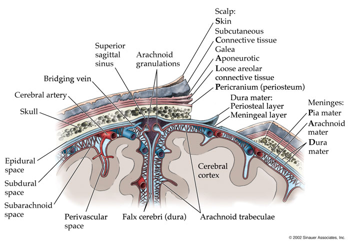 It doesn’t seem fair about the brain does it…all the E-Hollywood, red carpet attention it gets? I mean there isn’t a single one of us out there in this crazy world that can survive if our heart stops beating and that’s just as true for snow leopards, crickets, Glen Beck, and 3-toed sloths as it is for foxy human-beings like you and me. However, the brain is treated like the commander and chief of the body (which it pretty much is). By that I mean consider the level of security and protection the body invests in its head of state. Not only is some of the densest sections of bone in the body (contained in the skull) there to protect it from impact like a souped up, Seattle Seahawks NFL helmet but there is layer upon layer of security measures in place to maintain this safe, warm, cozy, zen-like environment surrounding the brain and spinal chord as well. One of those layers of security is a super fancy barrier of connective tissue between the brain and skull referred to as the “meninges.”